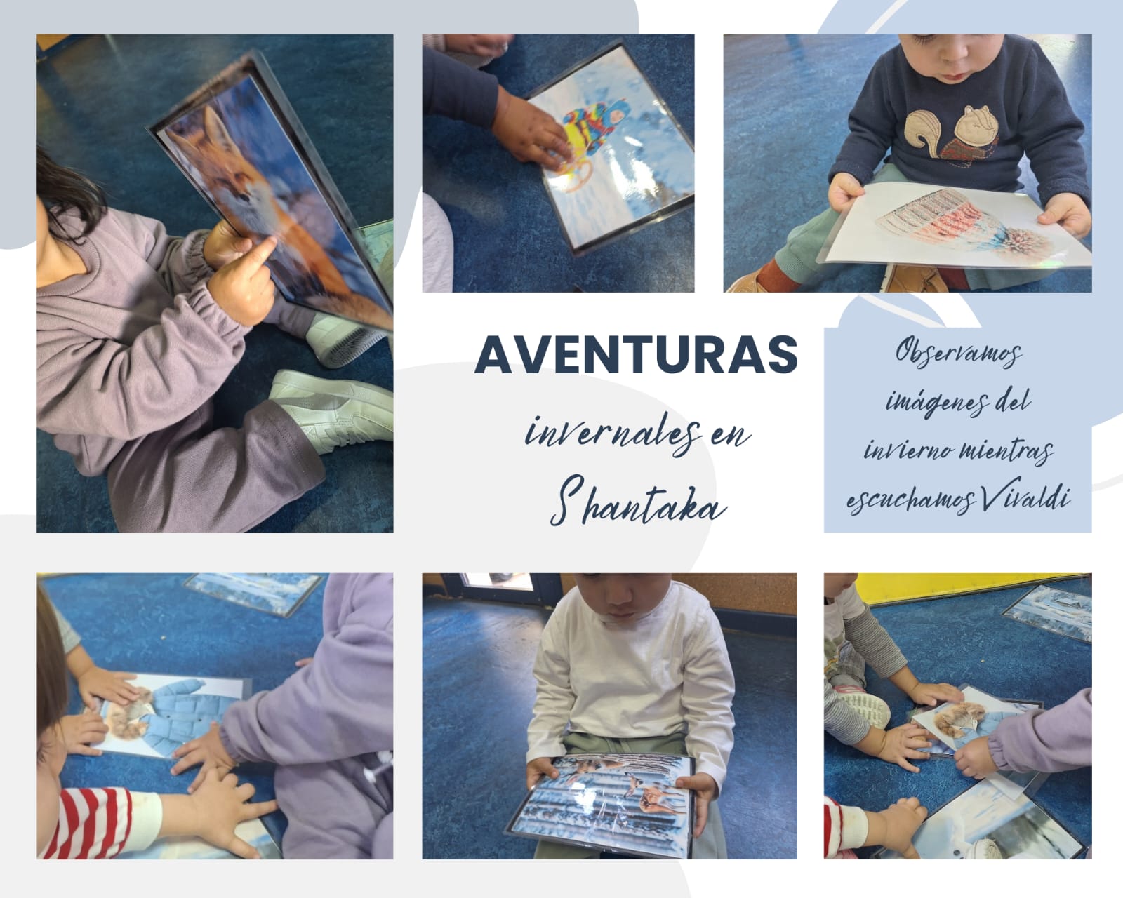 Aventuras invernales en Shantala. Observamos imágenes del invierno mientras escuchamos Vivaldi. Experimanetamos con colores.